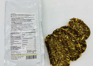 Zutaten: Mandelmehl, Sonnenblumenkerne, Kürbiskerne, Leinsaat, Flohsamenschalen, Chiasamen, Leinmehl, (salvia hispancia) Backtriebmittel Natron und Meersalz